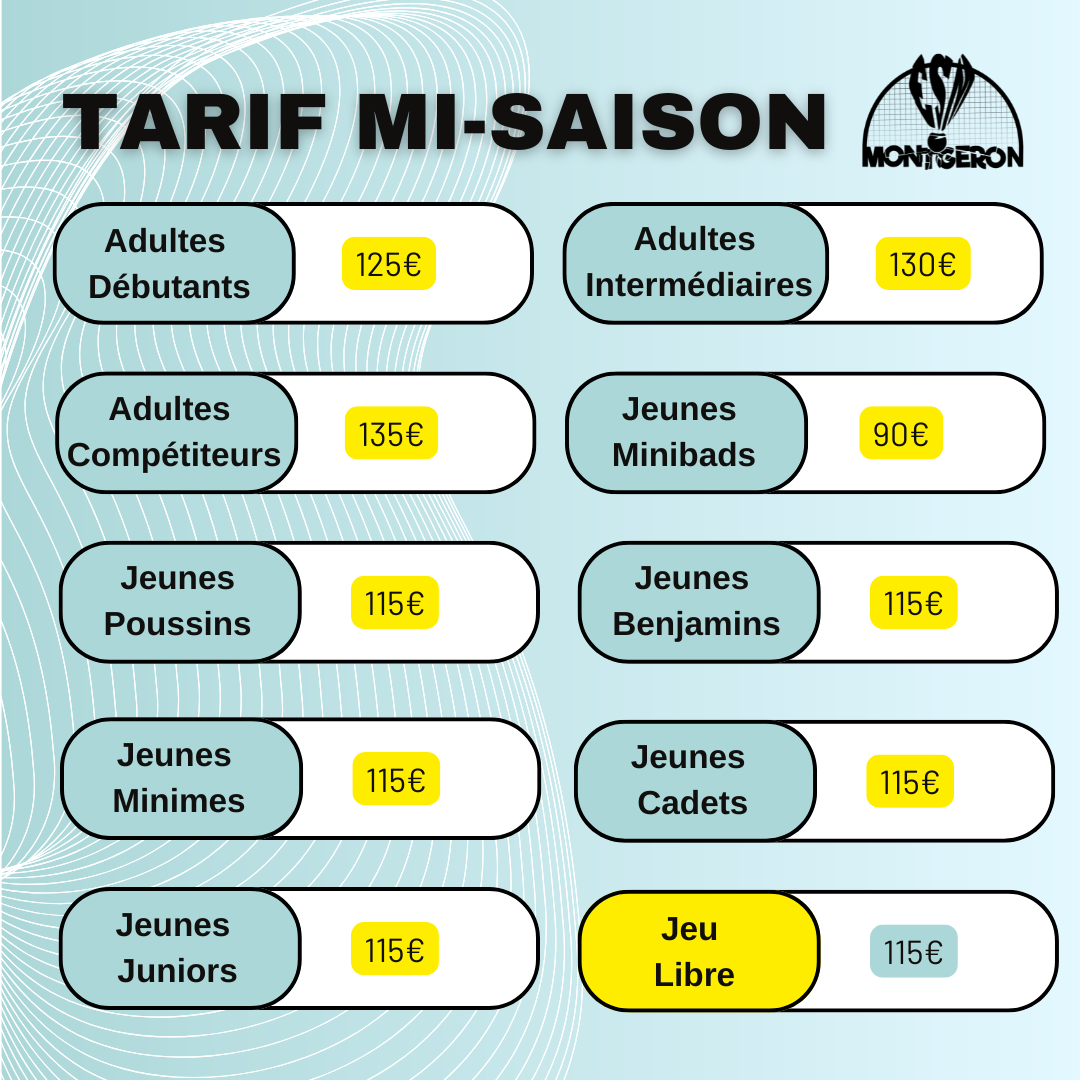 Le club, vous communique les tarifs mi-saison pour nos futurs adhérents.